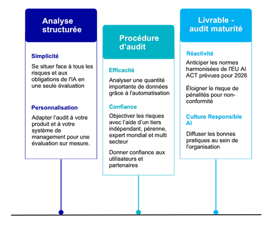 Faced with the regulatory challenges of the EU AI Act and the major risks associated with artificial intelligence—particularly misuse—Bureau Veritas supports you with a comprehensive maturity audit solution to assess and secure your generative AI systems, your AI projects, and your organizational capabilities. This approach is part of a transformation logic, tailored to the company’s role in the AI value chain and the competencies involved.