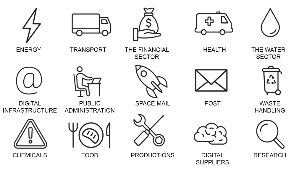 The NIS2 Directive applies more broadly and covers more sectors than NIS1. It also applies to companies operating or carrying out activities for EU companies within the scope. Among the covered areas are internet service providers, energy suppliers, utility companies, waste handling companies, banks, transporters, healthcare institutions, food production factories and digital infrastructure providers.